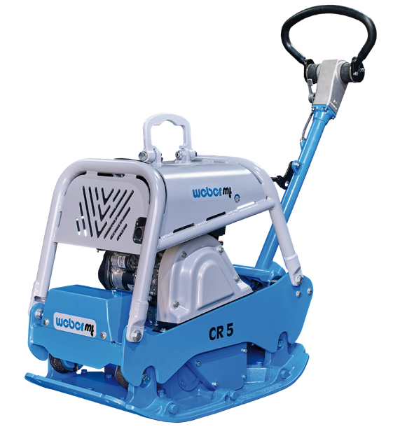 Plancha Compactadora Reversible CR5 – E  – WEBER Las exigencias de una nueva generación de máquinas en lo que respecta a marcha tranquila, transmisión de vibración mano/brazo del operador y una construcción sólida y segura, son introducidas también en nuestras placas para trabajos medianos de compactación. La placa reversible CR 5 aplica este concepto con óptimos resultados de compactación. La palanca del acelerador está a la vista del operador y se la alcanza cómodamente. El motor es protegido por un sólido armazón y revestimiento. Todos los componentes de mantenimiento están a la mano, lo que facilita el trabajo de servicio. Gracias a un amplio y sólido ojo de enganche, la máquina puede cargarse de manera rápida y segura. El arranque eléctrico en la versión CR 5 E y CR 5 Y E, ofrece confort adicional para el usuario. La CR 5 CCD está equipada con arranque eléctrico y sistema de control de compactación COMPATROL.